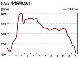 ABS(Acrylonitrile Butadiene Styrene)는 톤당 2000달러가 무너진 가운데 어디까지 추락할지 주목된다. 표, 그래프: <ABS 가격동향(2021)> <화학저널 2022년 2월 14일> |