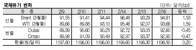 2월16일 국제유가는 미국의 석유 수요 증가 영향으로 급등했다. 2월16일 국제유가는 미국의 석유 수요 증가세 영향으로 급등했다. 표, 그래프: <국제유가 변화> <화학저널 2022/02/17> |