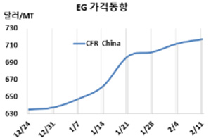 MEG(Monoethylene Glycol)는 700달러를 넘어서면서 상승세가 둔화되고 있다. MEG 시세는 2월9일 CFR China가 톤당 718달러로 5달러 올랐고 CFR SE Asia도 723달러로 5달러 상승에 그쳤다. 표, 그래프: <EG 가격동향> <화학저널 2022/02/17> |