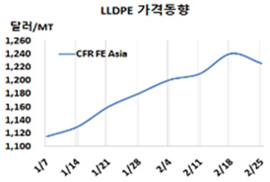 LLDPE(Linear Low-Density Polyethylene)는 동북아시아만 하락했다. LLDPE(Linear Low-Density Polyethylene) 시세는 2월23일 CFR FE Asia가 1225달러로 15달러 하락했으나 CFR SE Asia는 1305달러, CFR S Asia 역시 1325달러로 변동이 없었다. 표, 그래프: <LLDPE 가격동향> <화학저널 2022/02/28> |