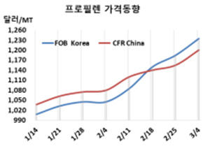 FOB Korea 1235달러로 50달러 올라 … 중국, PDH 50만톤 보수
