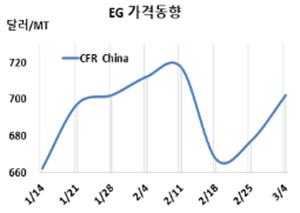 CFR China 703달러로 25달러 상승 … 에틸렌은 1200달러대 중반