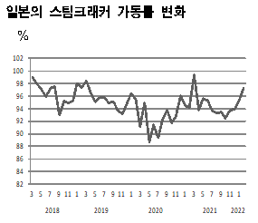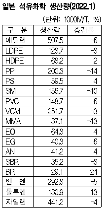 일본은 에틸렌(Ethylene) 풀가동 체제가 종료됐다. 표, 그래프: <일본의 스팀크래커 가동률 변화, 일본 석유화학 생산량(2022.1)> <화학저널 2022/03/14> |
