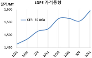LDPE(Low-Density Polyethylene)는 급등세를 나타냈다. LDPE 시세는 3월9일 CFR FE Asia가 톤당 1595달러로 40달러 급등했고 CFR SE Asia는 1715달러로 65달러 폭등했다. CFR S Asia도 1750달러로 90달러 폭등했다. 표, 그래프: <LDPE 가격동향> <화학저널 2022/03/14> |