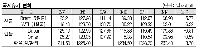 3월14일 국제유가는 러시아-우크라이나 협상 영향으로 폭락했다. 러시아와 우크라이나가 화상회의를 통해 4차 회담을 가지면서 당일 도출된 결과물이 없음에도 진전에 대한 기대감이 높아지고 있다. 표, 그래프: <국제유가 변화> <화학저널 2022/03/15> |