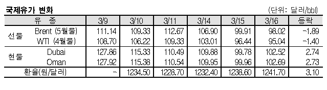 3월16일 국제유가는 러시아-우크라이나 회담 영향으로 급락했다. 우크라이나 대통령은 회담이 현실성을 띄기 시작했다고 밝혔고 러시아 외무장관은 협상에 어려움이 있으나 일부 합의에 근접해 있다고 발언함에 따라 양국 간 회담 지속에 따른 기대감이 확대되고 있다. 표, 그래프: <국제유가 변화> <화학저널 2022/03/17> |
