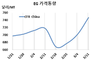 MEG(Monoethylene Glycol)는 원료가격 초강세에 정기보수 홍수로 급등했다. MEG 시세는 3월10일 CFR China가 톤당 748달러로 45달러 급등했고 CFR SE Asia는 743달러로 35달러 상승했다.