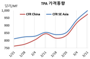 PTA(Purified Terephthalic Acid)가 원료가격 폭등으로 급등세를 계속하고 있다. PTA 시세는 3월10일 CFR China 톤당 975달러로 55달러 급등했고 CFR SE Asia도 1000달러로 60달러 급등했다. 표, 그래프: <TPA 가격동향> <화학저널 2022/03/17> |