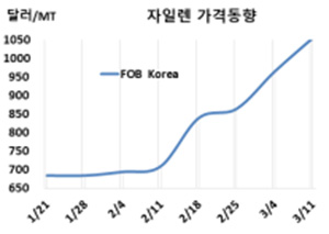 Isomer 그레이드 M-X도 3월11일 FOB Korea 톤당 1255달러로 90달러, CFR SE Asia 1265달러로 90달러, CFR Taiwan 1275달러로 80달러 폭등했다.