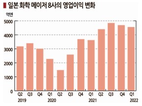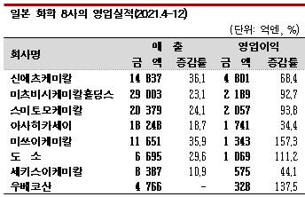 일본 화학 메이저 8사 가운데 5사는 석유화학 시황 상승, 반도체 및 의료 소재 호조를 타고 2021년 4-12월 사상 최대 영업이익을 기록했다.
