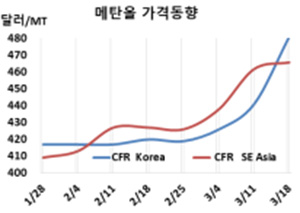 표, 그래프: <Methanol 가격동향> <화학저널 2022/03/25> |