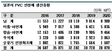 일본 무기약품협회에 따르면, 2020회계연도(2020년 4월-2021년 3월) PVC 안정제 생산량은 2만8870톤으로 전년대비 6.1%, 출하량도 2만9119톤으로 6.4% 줄어드는 등 4년 연속 감소세를 나타냈고 마지노선으로 여겨지는 3만톤이 무너졌다.