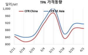 PTA(Purified Terephthalic Acid)는 원료가격 하락으로 급등세에 제동이 걸렸다. PTA 시세는 3월31일 CFR China가 톤당 890달러로 변동이 없었고, CFR SE Asia 역시 915달러로 보합세를 형성했다. 표, 그래프: <TPA 가격동향> <화학저널 2022/04/07> |
