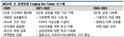 다우케미칼(Dow Chemical) 등 글로벌 화학 메이저들은 매출액에서 설비투자액이 차지하는 비율이 4-5% 정도인 반면 MCH는 7%로 높다는 점을 과제로 인식하고, 앞으로 사업 매각을 통해 약 5000억엔의 부채를 줄이고 2022년에는 회사명을 변경하는 등 간소화 및 합리화를 추진할 계획이다.