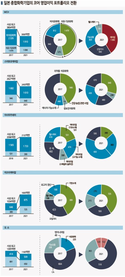 일본 화학 메이저들은 2017-2018년 석유화학 시황 상승으로 수혜를 입었으나 2021년에는 석유화학 시황이 폭등했을 뿐만 아니라 선제적으로 확대해둔 비석유화학 사업 덕분에 수익성이 개선된 것으로 나타났다.