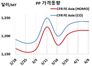 PP(Polypropylene)는 추가 상승으로 이어지지 못했다. 아시아 PP 시세는 4월6일 CFR FE Asia 기준 라피아(Raffia) 및 인젝션(Injection) 그레이드가 톤당 1215달러, IPP Film 및 BOPP는 1230달러, 블록 코폴리머(Block Copolymer)는 1240달러로 변동이 없었다. 표, 그래프: <PP 가격동향> <화학저널 2022/04/12> |