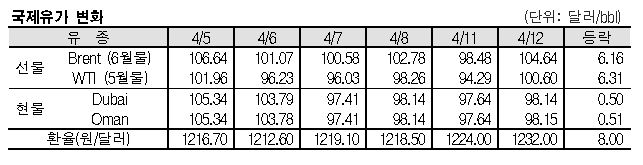 브렌트유, 104.64달러로 6.16달러 올라 … 두바이유는 98.14달러로