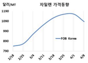 표, 그래프: <자일렌 가격동향> <화학저널 2022/04/14> |