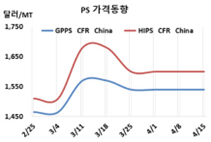 PS(Polystyrene)는 중국 내수가격이 하락해 주목된다.