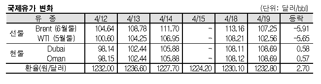 4월19일 국제유가는 IMF(국제통화기금)의 경제 성장 전망치 하향 조정 영향으로 폭락했다. IMF는 4월19일 발표한 세계 경제 전망 보고서에서 우크라이나 전쟁 영향 등으로 2022년 세계 경제 성장률 전망치를 기존(2022년 1월)의 4.4%보다 0.8%포인트 하향한 3.6%로 조정했다. 표, 그래프: <국제유가 변화> <화학저널 2022/04/20> |