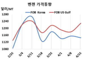 표, 그래프: <Benzene 가격동향> <화학저널 2022/04/20> |