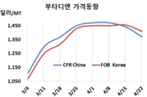 부타디엔 시세는 4월21일 FOB Korea가 톤당 1410달러로 45달러 하락했고 CFR SE Asia는 1390달러로 30달러 떨어졌다. CFR China 및 CFR Taiwan은 1370달러로 70달러 폭락했다.