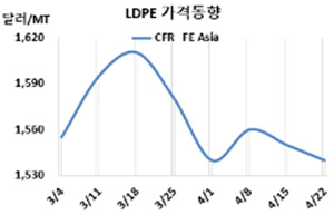 LDPE(Low-Density Polyethylene)는 소폭 하락에 그쳤다. LDPE 시세는 4월27일 CFR FE Asia가 톤당 1530달러로 10달러 하락했고 CFR SE Asia는 1705달러로 20달러 떨어졌다. CFR S Asia는 1720달러로 30달러 급락했다. 표, 그래프: <LDPE 가격동향> <화학저널 2022/05/02> |
