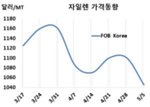 용제(Solvent) 그레이드 M-X 시세는 5월5일 FOB Korea가 톤당 1045달러로 55달러 급락했고 CFR SE Asia도 1080달러로 40달러 떨어졌다. CFR China 역시 1040달러로 50달러 급락했으나 CFR Taiwan은 1115달러로 30달러 상승했다.