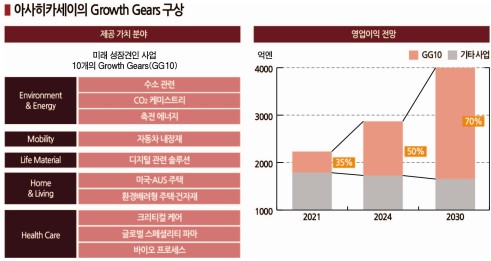아사히카세이는 2030년 장기전망으로 영업이익 4000억엔, ROE 15% 이상, ROIC 10% 이상의 수치목표를 설정하고 있으며 10대 사업 영업이익이 차지하는 비중을 2030년 70% 이상으로 확대할 계획이다.