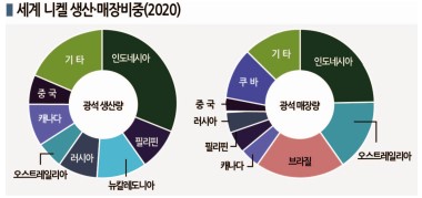 인도네시아는 세계 최대의 니켈 생산국으로 2020년에는 세계 생산량의 30%를 차지해 13%로 2위를 기록한 필리핀을 크게 앞섰다.