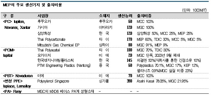 MEP는 PC 생산능력이 50만톤으로 변경되며 MGC가 PC 외의 EP 사업 확대를 위해 설립한 GPAC(Global Polyacetal)가 POM 22만톤 플랜트를 담당함으로써 사실상 기존 MEP 사업의 대부분을 MGC가 주도하게 될 것으로 예상된다.