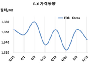 P-X 시세는 5월12일 FOB Korea가 톤당 1235달러로 55달러 급등했으나 CFR SE Asia는 1385달러로 20달러 상승에 머물렀다. CFR China는 1235달러로 55달러, CFR Taiwan은 1255달러로 65달러 급등했다.