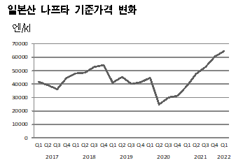 일본은 나프타(Naphtha) 강세가 장기화되고 있다. 표, 그래프: <일본산 나프타 기준가격 변화> <화학저널 2022/05/23> |