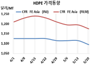HDPE 시세는 5월11일 인젝션(Injection) 그레이드가 CFR FE Asia 톤당 1095달러로 20달러 하락했고 CFR SE Asia는 1235달러로 40달러 폭락했다. CFR S Asia는 1370달러로 20달러 떨어졌다.