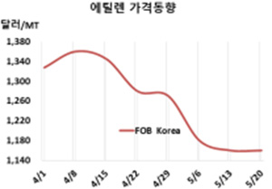 표, 그래프: <Ethylene 가격동향> <화학저널 2022/05/23> |