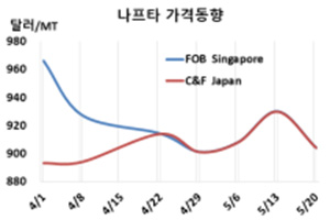 표, 그래프: <Naphtha 가격동향> <화학저널 2022/05/23> |