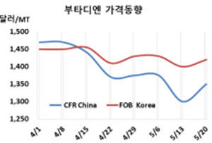 표, 그래프: <Butadiene 가격동향> <화학저널 2022/05/24> |