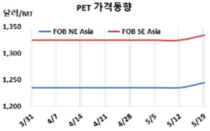 PET(Polyethylene Terephthalate)는 소폭 상승했다. Bottle 그레이드 PET 시세는 5월18일 FOB NE Asia가 1245달러로 10달러, FOB SE Asia도 1335달러로 10달러 상승했다. CFR S Asia 역시 1380달러로 10달러 올랐다. 표, 그래프: <PET 가격동향> <화학저널 2022/05/26> |