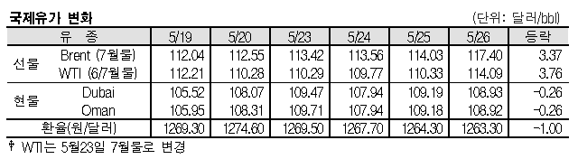 5월26일 국제유가는 미국 수요 증가 예상 영향으로 폭등했다. 미국은 Memorial Day 연휴 이후 시작되는 여름철 드라이빙 시즌을 앞두고 원유 수요가 증가할 것으로 예상되는 가운데 재고가 감소함에 따라 수급타이트가 계속될 것으로 예상되고 있다. 표, 그래프: <국제유가 변화> <화학저널 2022/05/27> |