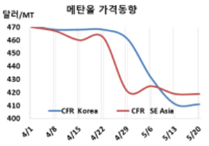 표, 그래프: <Methanol 가격동향> <화학저널 2022/05/27> |