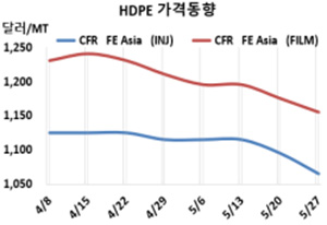 HDPE(High-Density Polyethylene)는 1100달러에서 멀어져갔다. HDPE 시세는 5월25일 인젝션(Injection) 그레이드가 CFR FE Asia 톤당 1065달러로 30달러, CFR SE Asia는 1205달러로 각각 30달러 폭락했고, CFR S Asia도 1330달러로 40달러 폭락했다. 블로우몰딩(Blow-Molding)은 FEA가 1070달러로 20달러 하락했고 SEA도 1245달러로 50달러 폭락했으며 SA는 1410달러로 25달러 떨어졌다. 표, 그래프: <HDPE 가격동향> <화학저널 2022/05/30> |