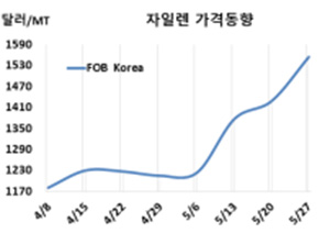 표, 그래프: <자일렌 가격동향> <화학저널 2022/06/03> |