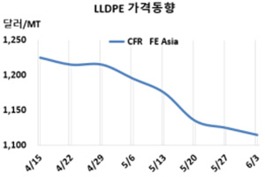 LLDPE(Linear Low-Density Polyethylene)는 하락세가 장기화되고 있다. LLDPE 시세는 6월1일 CFR FE Asia가 1115달러로 10달러, CFR SE Asia도 1265달러로 10달러, CFR S Asia 역시 1395달러로 10달러 하락했다. 표, 그래프: <LLDPE 가격동향> <화학저널 2022/06/07> |