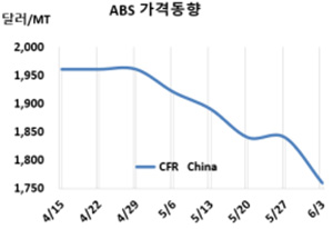 ABS(Acrylonitrile Butadiene Styrene)는 폭락세를 재연했다. ABS 시세는 6월1일 CFR China가 1760달러로 80달러 폭락했고 CFR SE Asia도 1830달러로 70달러 폭락했다. 특히, CFR S Asia는 2015달러로 120달러 대폭락했다. 표, 그래프: <ABS 가격동향> <화학저널 2022/06/09> |