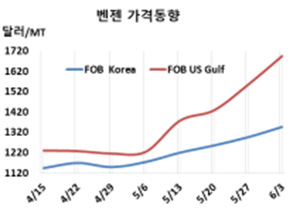 표, 그래프: <Benzene 가격동향> <화학저널 2022/06/09> |