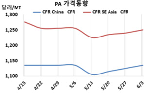 무수프탈산(Phthalic Anhydride)은 상승세를 이어갔다. 무수프탈산 시세는 6월3일 CFR China가 1135달러로 10달러 상승했고 CFR SE Asia도 1250달러로 10달러 올랐다. 표, 그래프: <PA 가격동향> <화학저널 2022/06/10> |