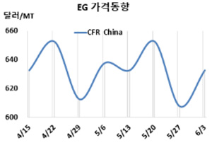 CFR China 633달러로 25달러 상승 … 에틸렌, 1045달러로 하락