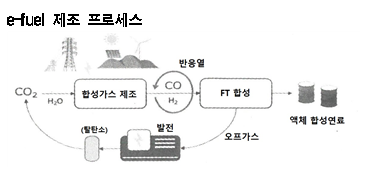 e-fuel은 일산화탄소(CO), 수소 등 합성가스 원료로 액상 탄화수소를 제조한 것이며 피셔트롭시(FT: Fischer-Tropsch) 공정으로 불리는 합성반응이 대표적이고 휘발유(Gasoline), 제트연료 등 원유로 제조한 석유제품과 동일한 성분의 연료를 제조할 수 있다.