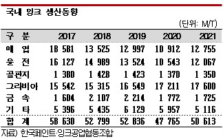반면, 매엽·윤전잉크는 2020년 2만1455톤으로 최저점에 도달한 후 반등했으나 확연하게 감소하는 추세를 이어가고 있다. 매엽잉크는 코로나19 발생 전인 2019년보다 2021년 생산량이 소폭 감소했고 윤전잉크는 1만2000톤선을 겨우 넘긴 것으로 나타났다.