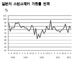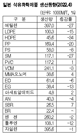 일본은 2022년 4월 에틸렌 생산용 스팀 크래커 가동률이 94.7%를 기록하며 손익분기점 기준 90% 이상 수준을 23개월 연속 유지했으나 전월대비로는 1.4%포인트 하락했다.